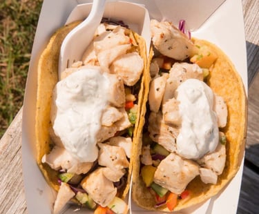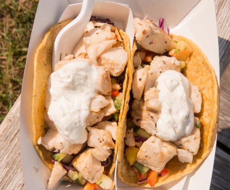 two tacos, grilled marinated haddock, ginger cucumber salsa, lime crema